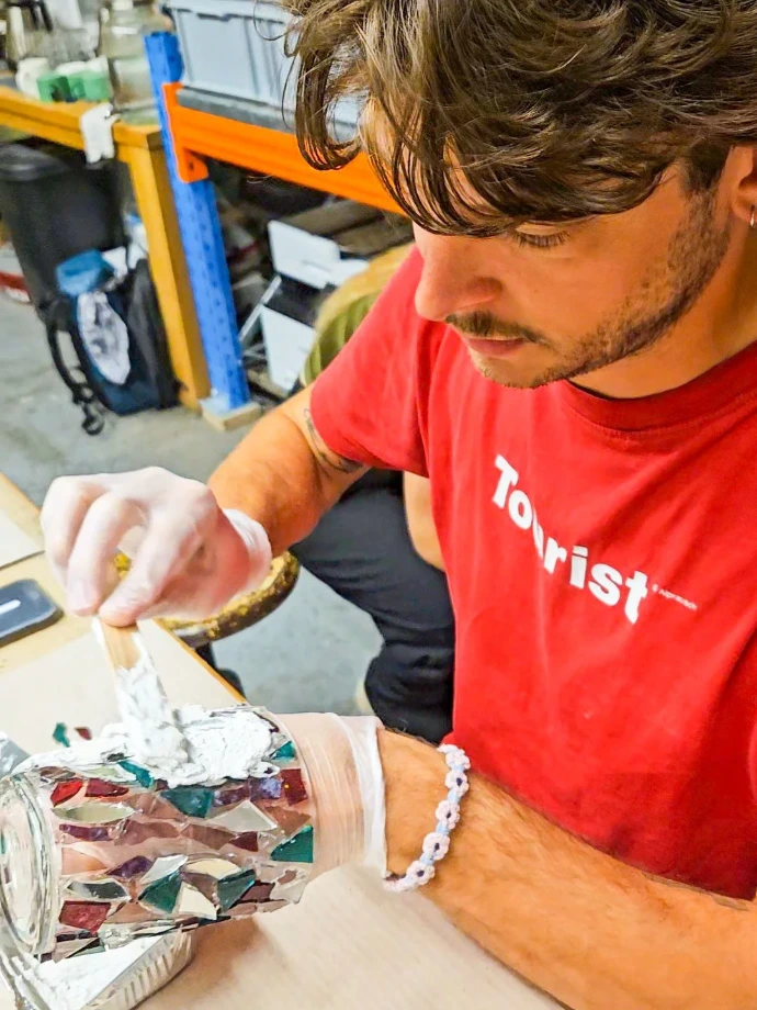 We klippen, kleven en wrijven, mét een glas cava of frisdrank erbij. Want mozaïek maken mag ook gewoon plezant zijn.