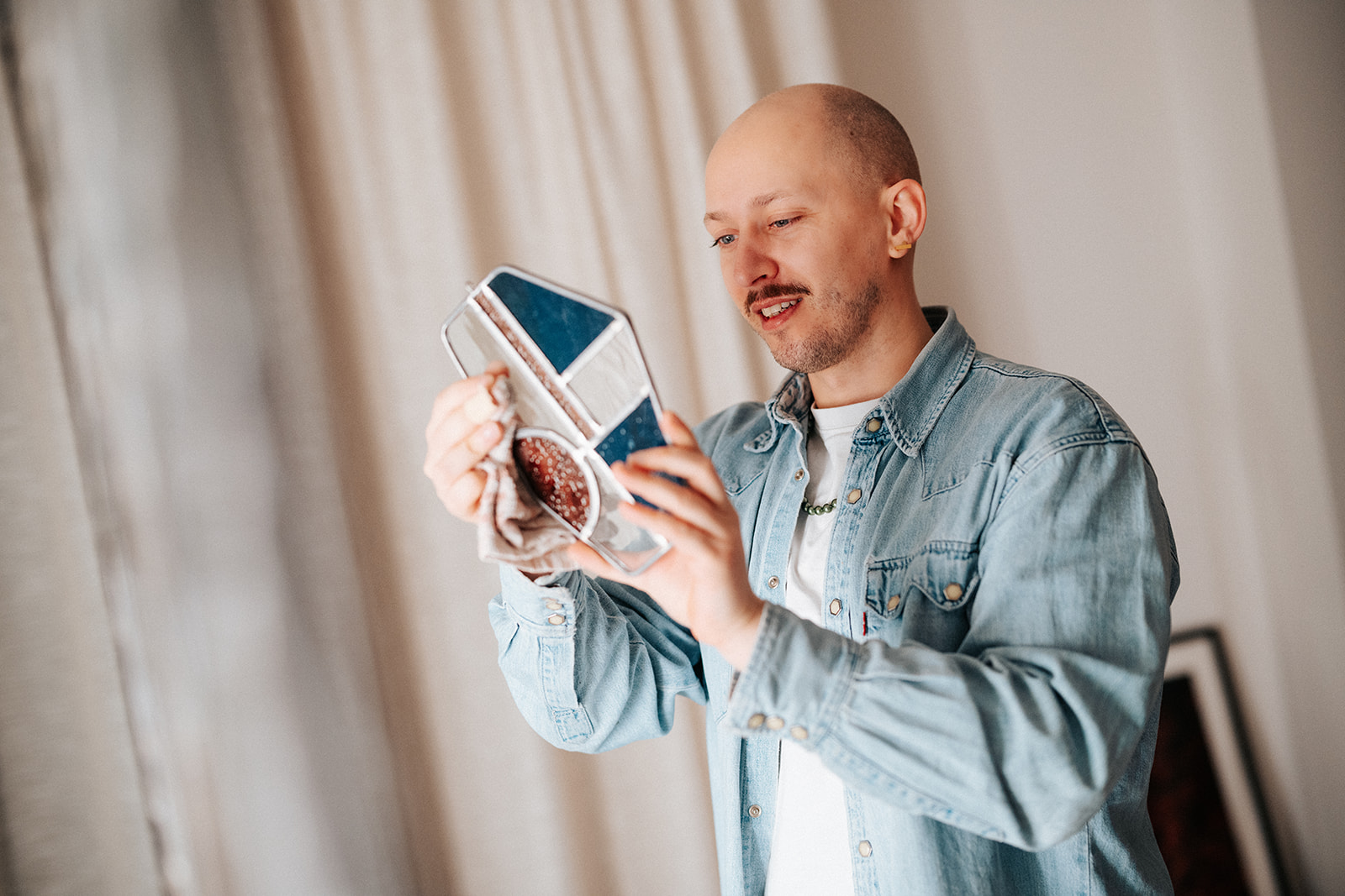 In 2020 besloot ik opnieuw met mijn handen te gaan werken en minder in mijn hoofd te leven. Die zoektocht bracht me naar de Koninklijke Academie voor Schone Kunsten in Antwerpen. Bij toeval botste ik op glas-in-lood. Een eeuwenoude ambacht, beladen met geschiedenis en vaak normerende verhalen. Net die spanning prikkelde me. Ik had geen voorkennis, wel een sterke intuïtie.